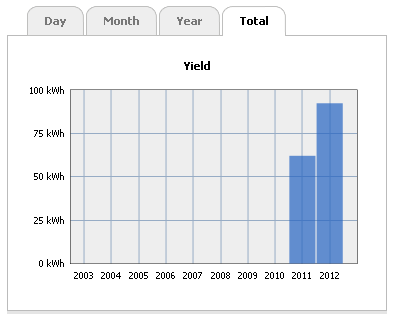 The left side panel shows your inverter details – serial number and plant name. The main panel shows performance and current yield. And below you will find tabs linking to various graphs showing daily, monthly, yearly and total statistics for you solar system.
